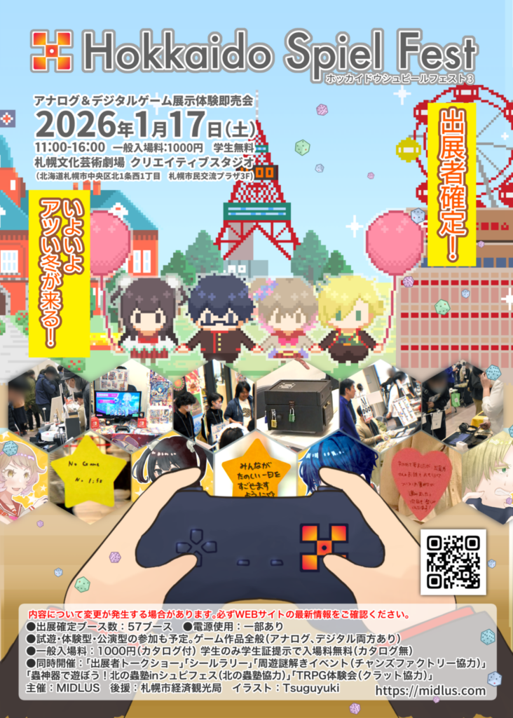 2026年1月17日(土曜)に、札幌文化芸術劇場クリエイティブスタジオで開催されたアナログ&デジタルゲーム展示体験即売会「ホッカイドウシュピールフェスト3」に、ゲーム作品コンテストの審査員と出展者トークショーのMCとして参加いたしました。